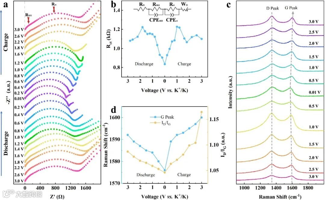 原位电化学阻抗谱图(EIS)显示,对于表面开放的片层状NOSHC-101-500-1来说,其活性位点更为暴露,与电解液接触更为充分。在钾化过程中,钾离子首先在表面富集,随后扩散到体相中,去钾化的过程与之相反。非原位拉曼光谱结果支持了上述结论,钾离子进入材料体相后,空间位阻和电子密度的增加,导致平面上C-C键伸缩振动增强,G峰红移,钾离子与活性位点的相互作用抑制了环中sp2碳原子的呼吸振动,ID/IG值减小。过于极端的Eads可能导致去钾化时钾离子的不完全解吸,造成不必要的不可逆容量损失。N/O/S三掺杂体系具有近似于N单掺杂的Eads,在热力学允许钾离子吸附的情况下,不会导致过多的钾离子损失,对吸附型储能有着积极的作用。