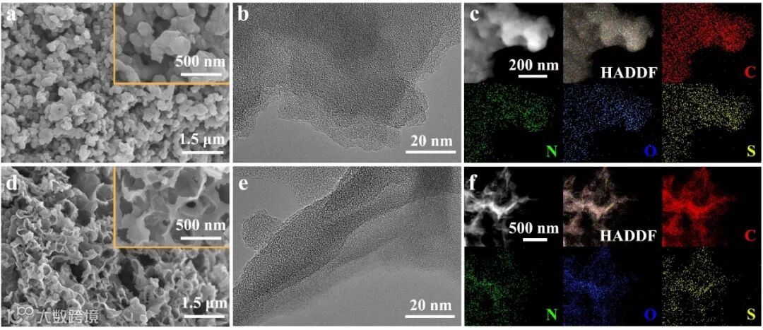 图2. NOSHC-11-500-1(a-c)及NOSHC-101-500-1(d-f)的微观形貌及元素分布。