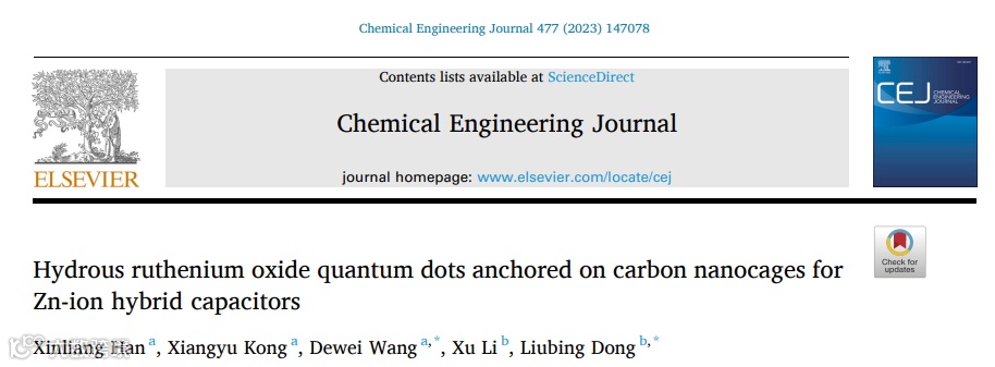 近日,来自北方民族大学的汪德伟教授与暨南大学的董留兵教授合作,在国际知名期刊Chemical Engineering Journal上发表题为“Hydrous ruthenium oxide quantum dots anchored on carbon nanocages for Zn-ion hybrid capacitors”的文章。该文章分析了目前常用于锌离子混合电容器的不同电极材料在实际运用中存在的一些电化学性能问题,并给出了相应的解决观点,同时对在含锌离子的弱酸性电解液中电荷储存机理进行探究。