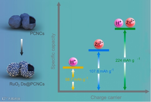 RuO2·xH2O相比于多孔碳、少层材料(如磷烯和硅氧烷)和有机物等正极材料具有电阻低,理论比容量大,在酸性和碱性电解质中都具有良好的结构稳定性,是锌离子混合电容器最理想的正极材料之一。然而,高表面能的小尺寸量子点容易发生自聚集,导致电化学性能下降会阻碍其实际应用。并且在含锌离子的弱酸性电解液中,电荷储存机理尚未完全明确,特别是氢离子对电荷储存性能的影响尚未得到充分研究。本文的观点是构建RuO2 QDs@PCNCs异质结构材料,以打破EDLC低电容和小尺寸RuO2·xH2O聚集的限制,同时利用不同电解质和非原位测试探究Zn2+和H+对提高RuO2 QDs@PCNCs-based正极的电荷存储能力至关重要。