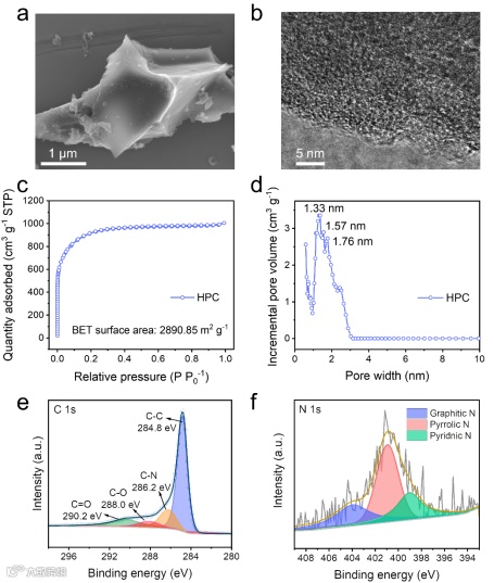 作者对HPC的形貌进行了表征,TEM结果显示其表面具有丰富的微孔结构,这在BET结果中得到了证实,其比表面积高达2890.85 m2/g。高的比表面积和丰富的孔道结构均有利于氯气的吸附作用。