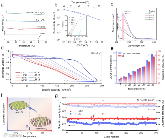 得益于磷酸基电解液优异的抗冻性能,作者对氢氯电池的低温性能也进行了探究。结果表明,低温下氯气从不可控的气态逐渐转化为液态形式,充电后其可直接沉积在HPC上。紫外光谱表明副产物次氯酸随着温度的下降而明显减少,说明低温对于氯气副反应的抑制作用明显。这在不同温度下的充放电测试中也可见一斑,在从0 ℃逐渐下降到-70 ℃时,Cl2/Cl-的放电平台得到逐步展现,在-70 ℃时其对总容量的贡献达到了77%,库伦效率也达到了94%。氢氯全电池可在-40 ℃下稳定循环300圈,平均库伦效率为91%。