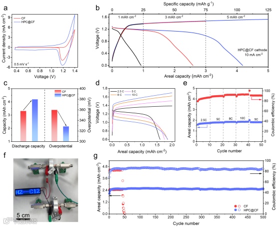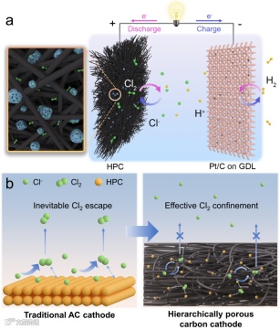 传统的活性炭电极由于其缺少与氯气的强亲和性位点,充电时产生的氯气会不可避免地逸出,在下一次放电过程中无法被再次还原,导致低可逆性。本文中,作者设计了具有丰富微/介孔多孔碳(HPC)和具有三维大孔结构的碳毡所组成的分级多孔碳正极(HPC@CF),其在充电时能够将产生的氯气有效地限制在正极,增强其放电的可逆性。