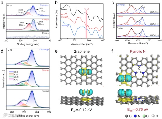 此外,XPS和红外光谱等表征手段成功探测出C-Cl键的可逆转化。理论计算表明吡咯氮掺杂多孔碳的局部电子环境被改变,使得碳对氯气的吸附作用增强,从而实现C-Cl键的可逆形成和转化,并增强Cl2/Cl-电对的可逆性。这项工作为宽温区水性氯基电池和高能量密度氢气电池的设计提供了新的方向。