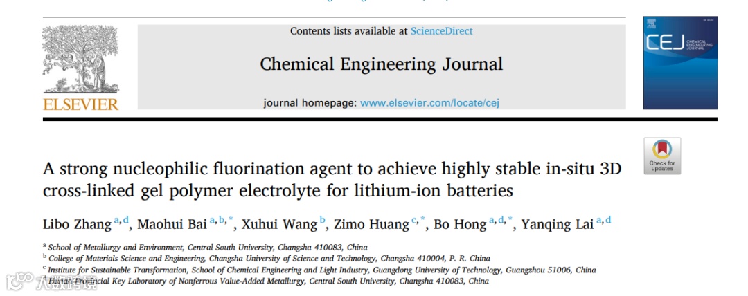 近日,中南大学洪波、长沙理工白茂辉与广东工业大学黄子默合作,在国际知名期刊Chemical Engineering Journal上发表题为“A strong nucleophilic fluorination agent to achieve highly stable in-situ 3D cross-linked gel polymer electrolyte for lithium-ion batteries”的观点文章。在这项研究中,作者们引入了一种原位3D交联的GPE,使用聚甲基丙烯酸甲酯(PMMA)作为单体和聚乙二醇二甲基丙烯酸酯(PEGDMA)作为交联剂,以确保结构稳定性和高的离子导电性。研究中加入了一种强效的亲核氟化剂,四丁基铵氟化物(TBAF),以增强所配制的 FGPPE 的兼容性和抗氧化性。PEGDMA 的(-CH2CH2O-)重复单元,结合原位氟化锂(LiF)和由 TBAF 引入的 C-F 基团,赋予 FGPPE 显著的离子导电性,达到7.8 mS cm-1,以及明显的电化学稳定性,为4.65 V。值得注意的是,具有富含F的固态界面(SEI)的锂金属负极,展现了均匀的Li+沉积,维持了1000小时的循环寿命,并在300次循环过程中保持了98.5%的平均库仑效率。此外,与 FGPPE 集成的 NCM811/SiC 软包电池显示出卓越的循环稳定性,在4.45 V的高电压下,经过600次循环后保持了99.4%的容量。