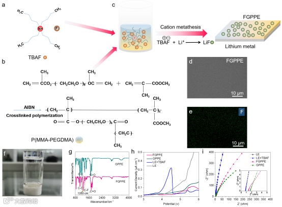 图1. 原位三维交联凝胶聚合物电解质FGPPE合成机理及其表征分析。