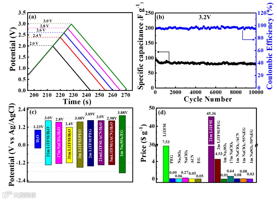 图1. 以活性炭为电极组装对称超级电容器,得到的器件的工作电压高达3.2 V. 1m Na2SO4/EG水系电解液在不使用超浓盐的情况下实现了3.88 V的电化学稳定窗口,优于WIS电解液。此外,这种电解液的成本只有0.03$/g。