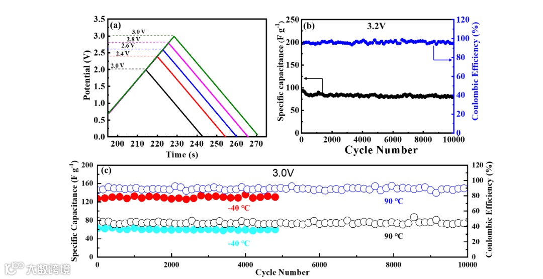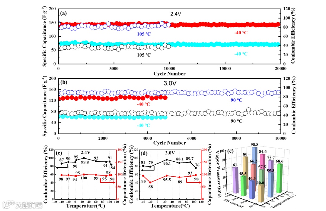 基于活性炭基水系超级电容器在−40℃— 105℃的温度范围内表现出优异的电容特性。在2.4V工作电压下,器件在-40℃测试得到的容量保持率高达97.7%。此外,在高温下循环上万圈时,库伦效率高于90%。为了进一步证明所制备超级电容器在高压及高温下的性能,设置工作电压为3.0V,温度范围为-40℃— 90℃,其容量保持率在90%以上。令人印象深刻的电化学性能可能归因于EG优异的防冻和耐热能力,使得水系电解液表现出较宽的温度范围。
