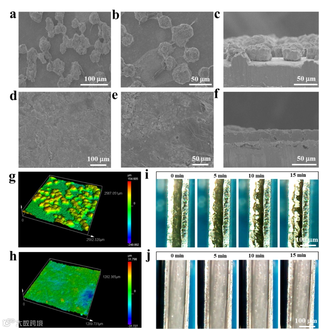 Figure 4 SEM images of Zn anode surface after 50 cycles with (a) (b) CNF separator and (d) (e) CN+LMS separator. Cross-section image of Zn anode after 50 cycles with (c) CNF separator and (f) CN+LMS separator. 3D measuring laser microscope images of Zn anodes with (g) CNF and (h) CNF+LMS separators. In-situ optical observation of Zn anodes when plating with (i) CNF and (j) CNF+LMS separator.