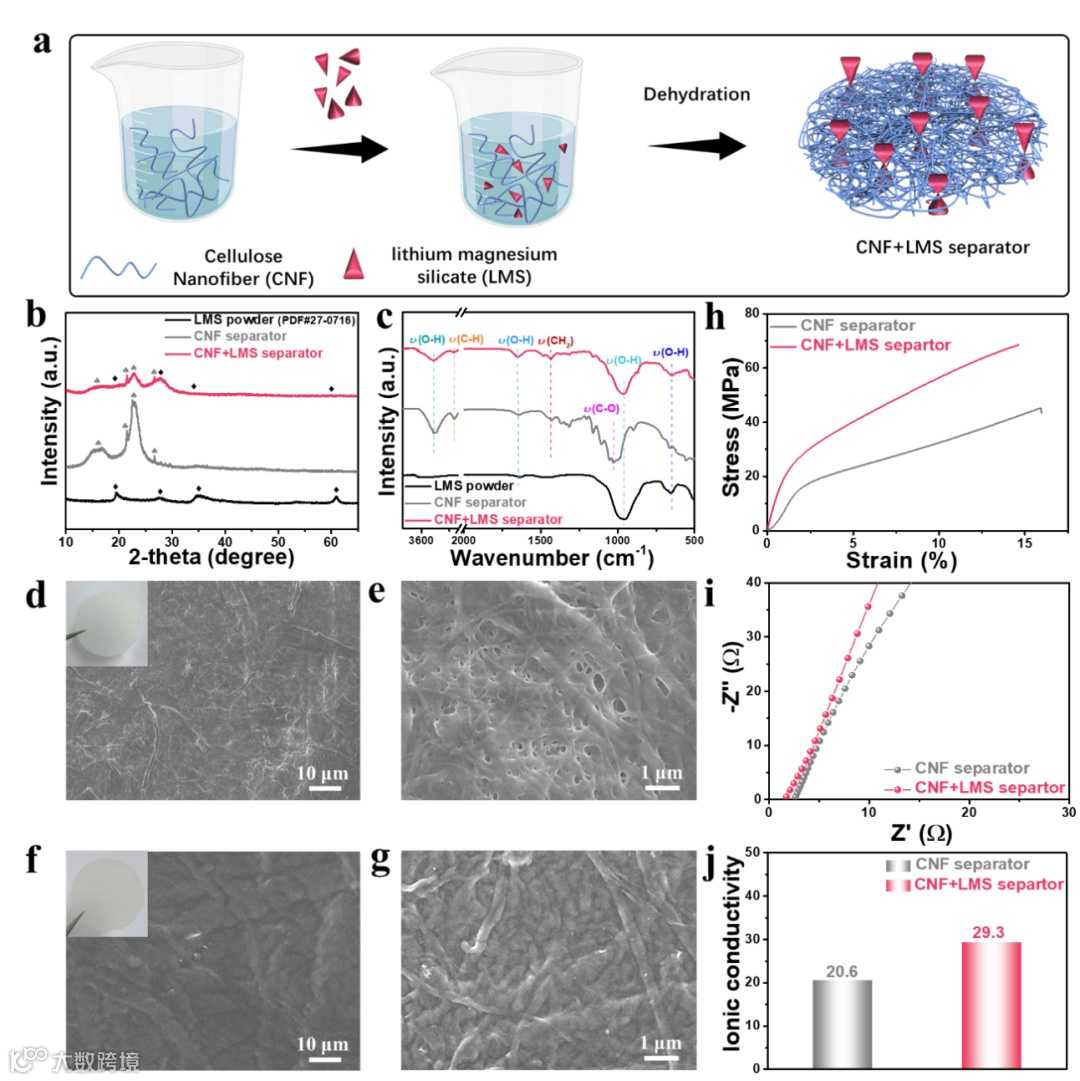 Figure 1 (a) Synthesis process of CNF+LMS separator. (b) XRD pattern, (b) FTIR spectrum of CNF and CNF+LMS separator. SEM images of (d) (e) CNF and (f) (g) CNF+LMS separators. (h) Stress–strain curves, (i) EIS plots and (j) ionic conductivity of CNF and CNF+LMS separator.