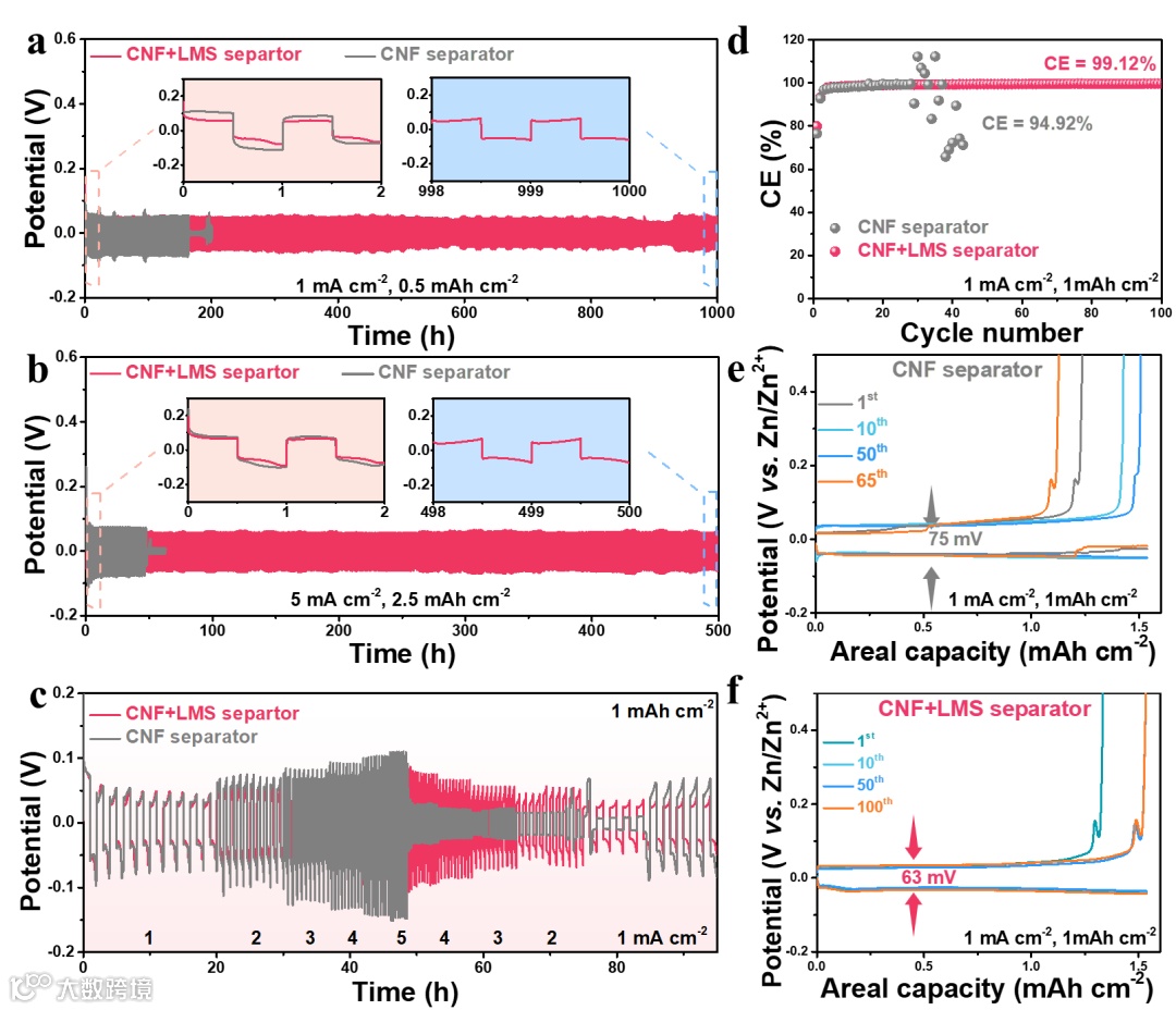 要点三:CNF+LMS隔膜促进可逆锌沉积/剥离,抑制锌枝晶