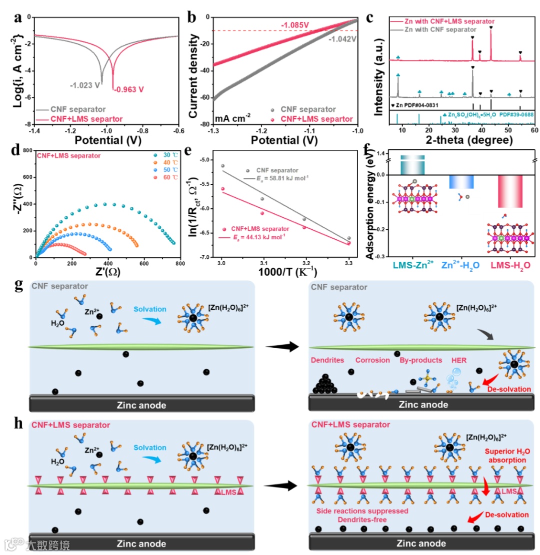 Figure 5 (a) Tafel plots, (b) LSV curves of the configurations with CNF and CNF+LMS separators. (c) XRD patterns of Zn anodes after 50 cycles with CNF and CNF+LMS separators. (d) The variable temperature EIS of the cell with CNF+LMS separator. (e) Calculated activation energy in the configurations with CNF and CNF+LMS separators. (f) Calculated adsorption energy of LMS-Zn2+, Zn2+-H2O and LMS-H2O.