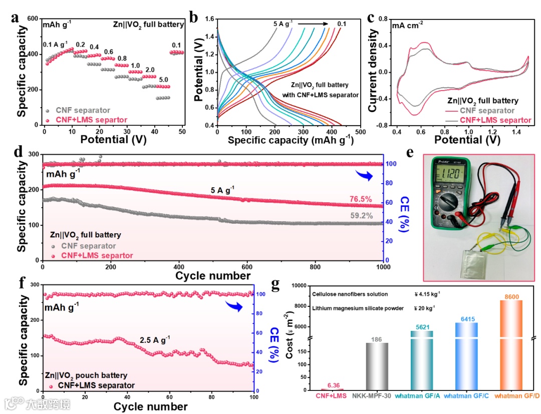 Figure 3 (a) Rate capacities of the Zn||VO2 batteries with CNF and CNF+LMS separators. (b) Charge/discharge curves of Zn||VO2 battery with CNF+LMS separator. (c) CV curves of Zn||VO2 batteries with CNF and CNF+LMS separators at 0.1 mV s-1. (d) Cycling performance of Zn||VO2 batteries with CNF and CNF+LMS separators. (e) Photo of the Zn||VO2 pouch cell. (f) Cycling stability of Zn||VO2 pouch cell with CNF+LMS separator. (g) Comparison of the cost of CNF+LMS separator and commercial glass fiber.