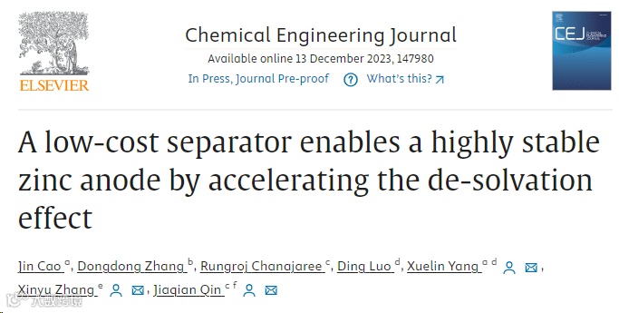 低成本隔膜通过加速去溶剂化作用实现高度稳定的锌阳极