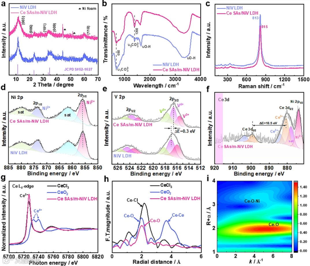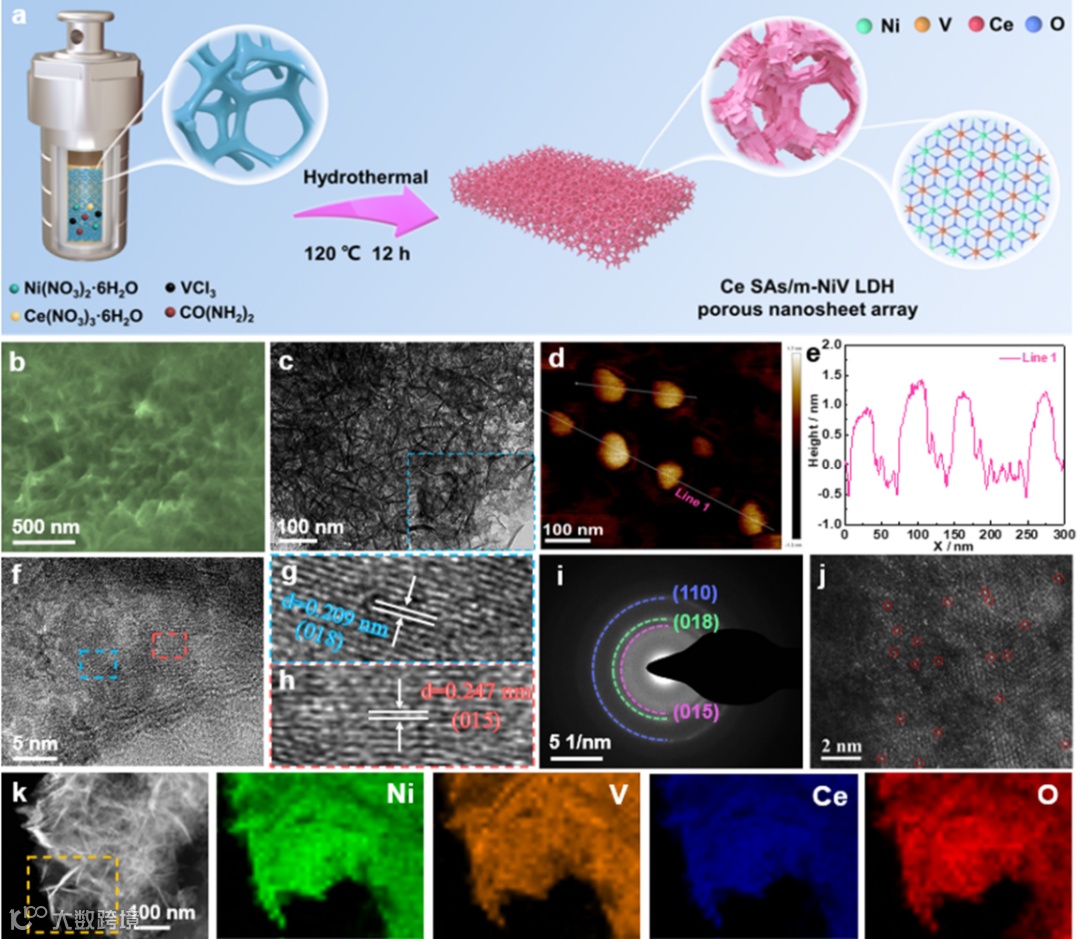 要点一:采用一步法将孤立的Ce原子成功锚定于单层NiV LDH载体(Ce SAs/m-NiV LDH),呈现出垂直排列和互连的超薄纳米片阵列结构。富空位的单层NiV LDH可以为稳定Ce 单原子提高丰富锚定位点。