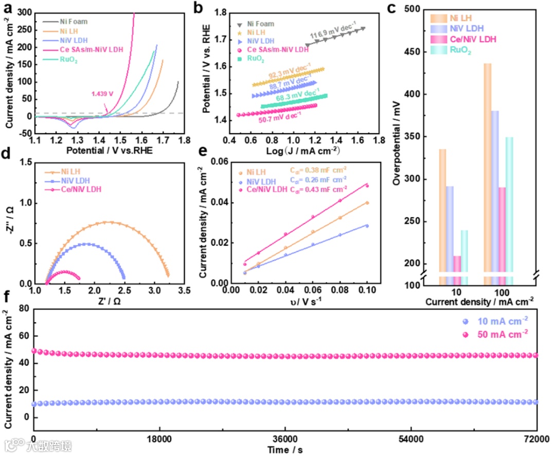 要点二:球差电镜结合X射线吸收光谱进一步确认Ce单原子的存在;基于单原子Ce与单层NiV LDH载体间强电子耦合作用,诱导空间电荷再分布和V 原子周围无序配位环境,赋予Ce SAs/m-NiV LDH优异的OER和水分解性能。