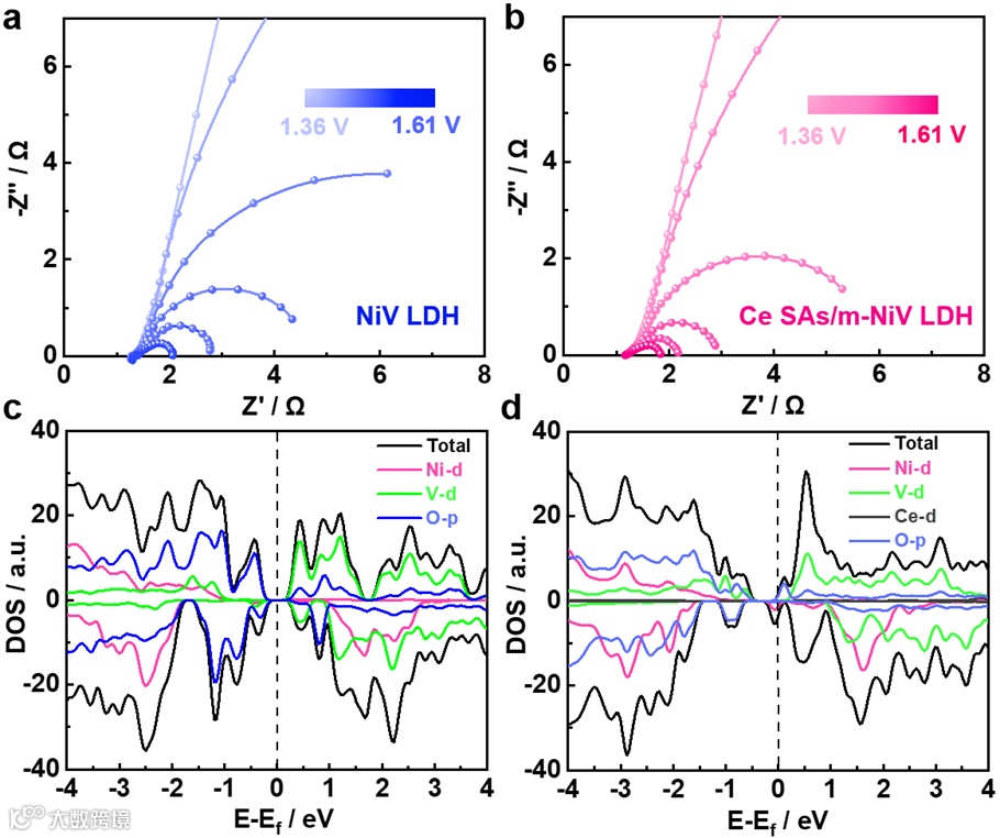 要点三:原位电化学阻抗谱结合密度泛函理论计算揭示Ce单原子引入的积极作用:Ce单原子的锚定可以有效增强费米能级附近密度态、降低材料带隙和增强OH*吸附,从而降低电荷转移势垒并加快水分解动力学。