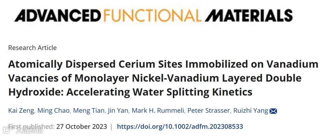 近日,苏州大学杨瑞枝教授、西南交通大学曾楷博士在国际知名期刊Advanced Functional Materials(IF: 19)上发表题为“Atomically Dispersed Cerium Sites Immobilized on Vanadium Vacancies of Monolayer Nickel-Vanadium Layered Double Hydroxide: Accelerating Water Splitting Kinetics”的研究文章。该研究工作通过V缺陷捕获策略成功将高载量Ce 单原子锚定于单层 NiV LDH载体(Ce SAs/m-NiV LDH)。实验结果结合原位表征与理论计算进一步揭示Ce单原子与单层NiV LDH载体间强电子耦合作用诱导空间电荷再分布和局部扭曲的配位环境,从而有效地减小材料带隙并增强费米能级附近密度态,显示出增强的导电性能和加速的OER反应动力学。