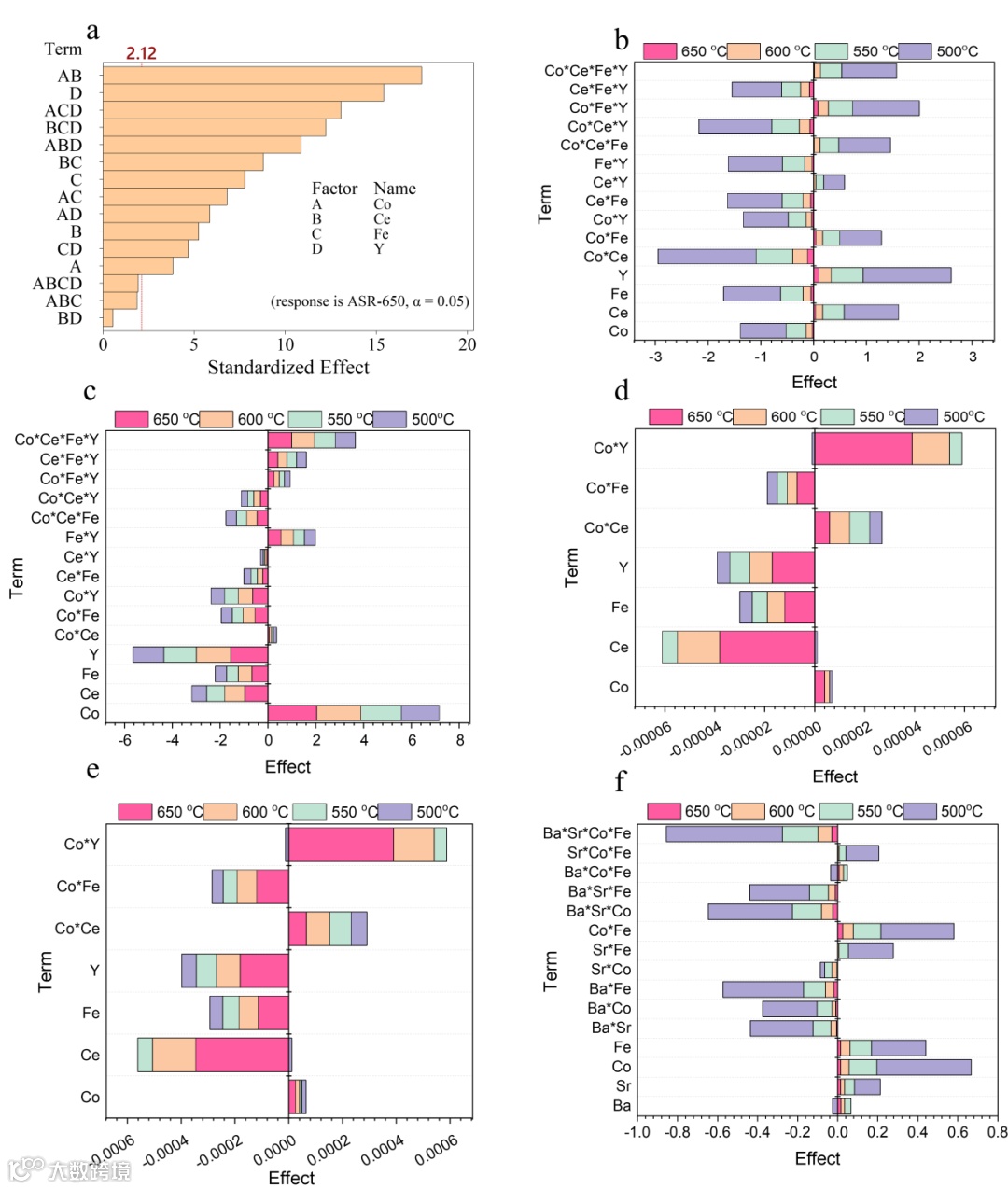 图 3:对 BaCoαCeβFeγYζO3-δ和BaαSrβCoγFeζO3-δ系列在 500-650 °C温度下 ORR 变化的影响分析。