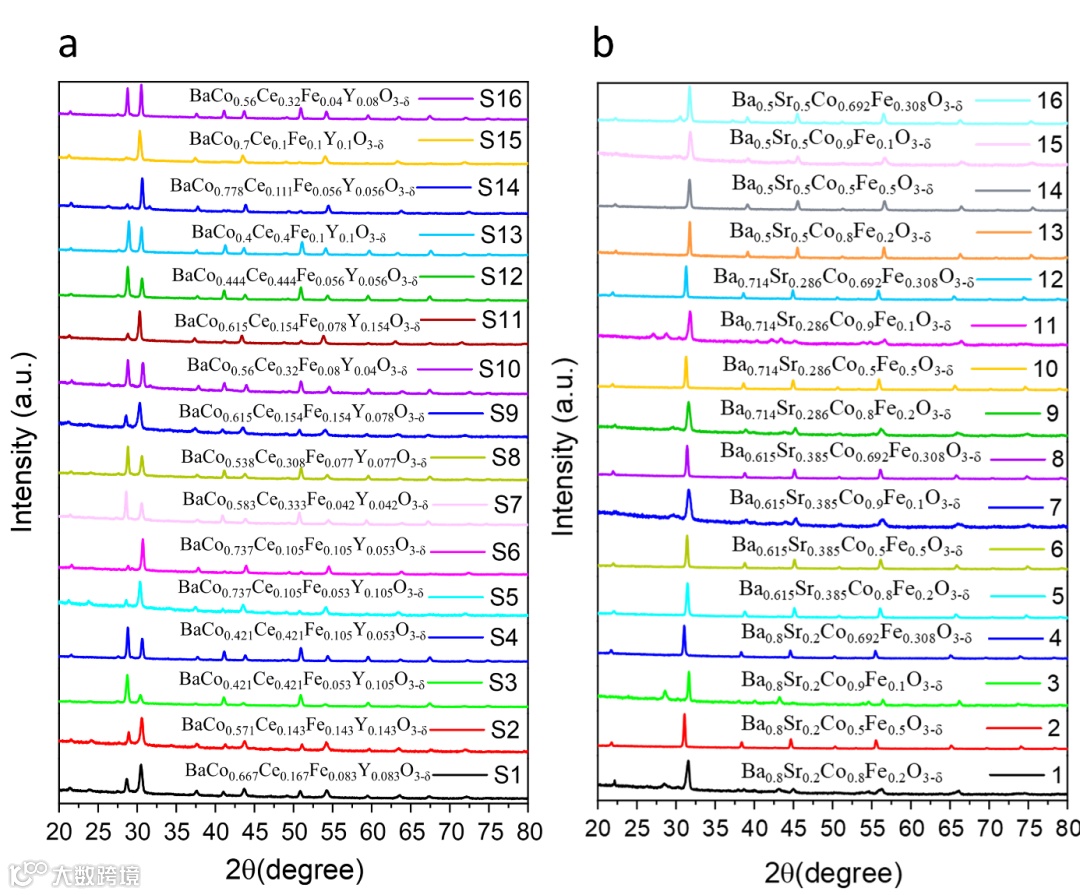 EDP 方法涉及系统地改变 BCCFY 和 BSCF 阴极材料的元素组成和化学计量比。正如 XRD 图案的变化所证明的那样,这种成分调整引发了样品晶体结构的可测量差异(图 2)。Rietveld 精修定量地证实了晶格结构的演变。这表明成分是影响阴极晶体学的重要因素。