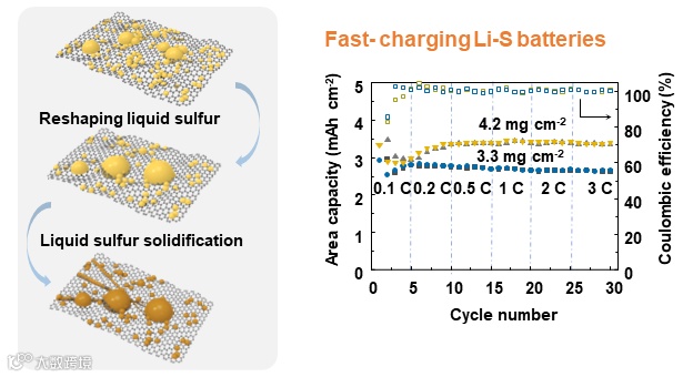 图1.硫在单程石墨烯的生长过程(左)和支持液态硫生成的正极材料在锂硫电池中展现出快充性能(右)。
