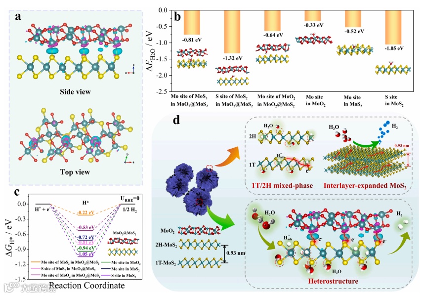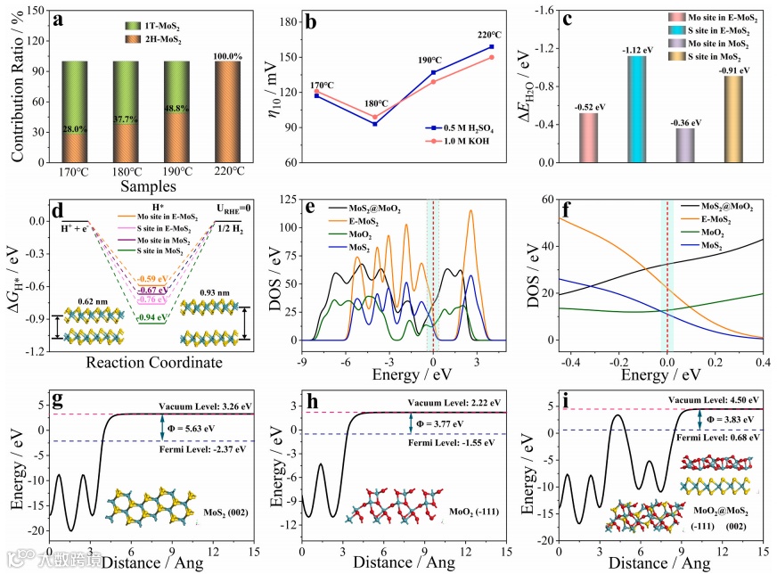 研究1T相的含量对于性能的影响。众所周知,相比于2H相MoS2,1T相具有更加优异的HER催化性能。本文通过控制硫化温度来控制MoS2中1T相和2H相含量占比,并分别测试了HER催化性能。虽然低温会导致1T相含量的提升,但是低晶化程度会降低催化性能。因此,在平衡1T相含量和晶化程度后,180oC成为最佳的硫化反应温度,此时1T相的含量占比为62.3%。(2)研究扩层结构对HER催化机制的影响。首先,相比于本征态MoS2,利用DOS验证了扩层结构有利于电极导电性的提高。其次,利用DFT计算分别计算了本征态MoS2和扩层MoS2中Mo位点和S位点对于H2O吸附能和H的吉布斯自由能。计算结果表明,扩层结构有利于提高催化剂对H2O的吸附能力并优化了ΔGH*。更重要的是,计算结果表明在MoS2中,S位点更有利于H2O的吸附,而Mo位点更有利于优化ΔGH*。(3)研究异质结构对HER催化机制的影响。分别计算了MoO2、MoS2和MoO2@MoS2的功函数,计算结果表明形成异质结构后二者发生了电子转移。之后利用差分电荷进一步明确电荷转移路径为MoO2转移到MoS2,与之前XPS拟合结果一致。最后分别计算了MoO2@MoS2的异质结构中MoO2的Mo位点、MoS2的Mo位点和MoS2的S位点的ΔEH2O和ΔGH*,进一步明确了S位点是H2O的吸附位点,而MoS2中的Mo位点具有最优的ΔGH*,有利于HER催化反应的发生。