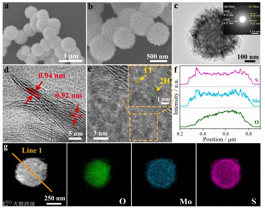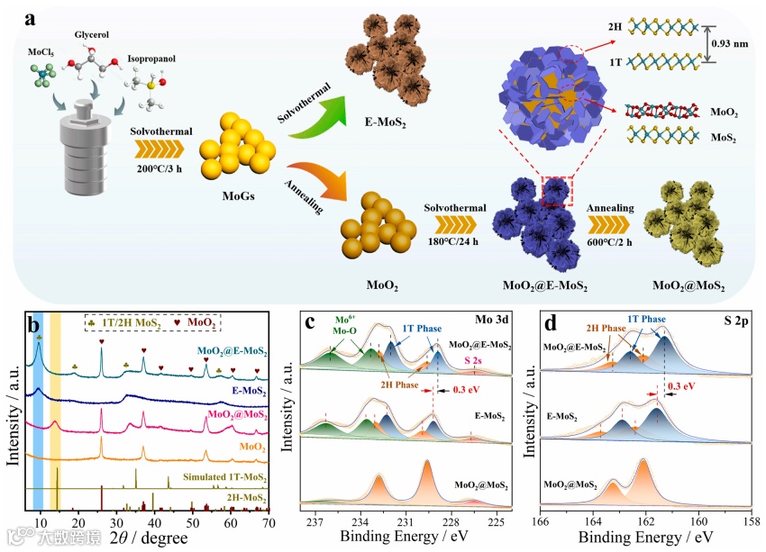 利用溶剂热法以及热处理的策略制备了内层为MoO2,外层为扩层结构的1T/2H相MoS2纳米花球,二者构建成MoO2@E-MoS2异质结构催化剂。其中,XRD图谱中(002)晶面衍射峰向低角度偏移证明MoS2层间距变大,且HRTEM图显示其层间距由0.62 nm扩大到0.93 nm。层间距的扩大主要是由于低温度硫化时,材料硫化不完全导致MoS2层间部分残留的Mo-O键(MoOx(OH)y),进而支撑起MoS2层间。HRTEM图中MoS2存在三角配位八面体结构的1T相和蜂窝状三角锥结构的2H相,证明1T/2H 混合相的存在。此外,利用XRD和XPS拟合图谱等多种手段也都能证明合成的MoS2为1T/2H混合相。另外,利用XPS图谱中Mo 3d和S 2p的峰偏移说明在MoO2@E-MoS2的异质结构中,电子由MoO2转移到MoS2。