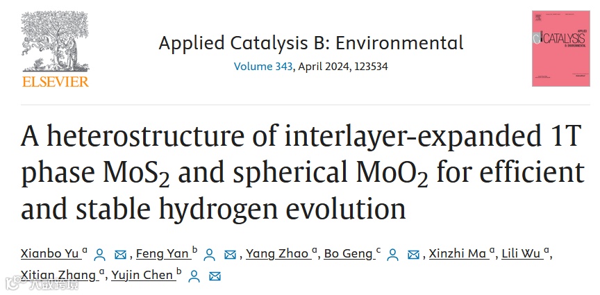 近日,来自哈尔滨师范大学的于贤波博士与哈尔滨工程大学陈玉金教授和闫峰博士、河南科技大学的耿博博士合作,在国际知名期刊Applied Catalysis B: Environmental上发表题为“A heterostructure of interlayer-expanded 1T phase MoS2 and spherical MoO2 for efficient and stable hydrogen evolution”的研究论文。该文章阐述了层间距扩大的1T-MoS2和球形MoO2异质结构(MoO2@E-MoS2)的形成机制,并通过控制反应温度来调控1T相MoS2的含量,分析1T含量的提升对于催化性能的影响;利用性能测试、功函数、差分电荷和DFT计算等手段研究了异质结构和扩层结构对于催化剂活性位点数量、电极导电性、水的吸附能(ΔEH2O)、H的吉布斯自由能(ΔGH*)、活性位点分布情况的影响,并给出该电极的深层次催化反应机制。