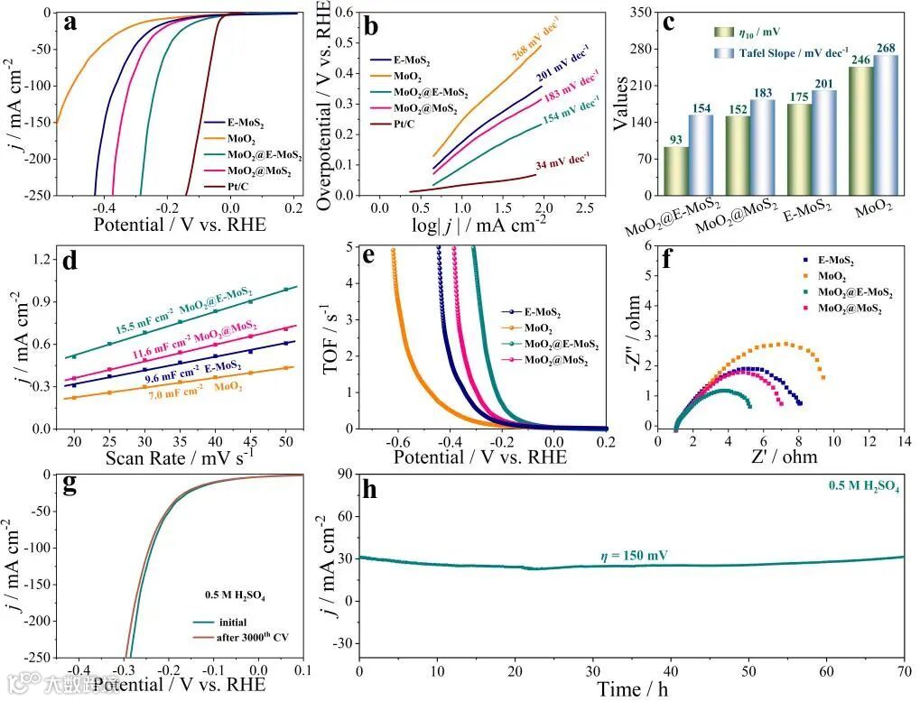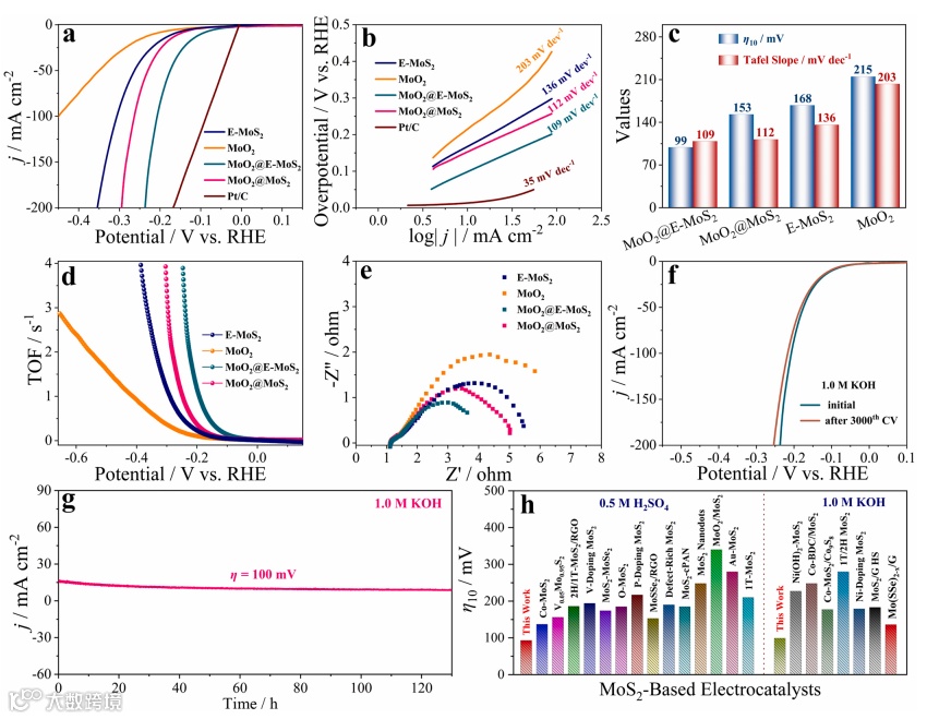 在0.5 M H2SO4和1.0 M KOH溶液中,异质结(MoO2@E-MoS2)均展现了优异的HER催化活性和稳定性。在10 mA cm−2的电流密度下,在酸和碱介质中的过电位分别为93 mV和99 mV。与此同时,该催化剂也展现出优异的长时间稳定性,在酸性介质中可稳定70 h(电流密度在30 mA cm−2),在碱性介质中可以稳定工作超过130 h(电流密度在10-20 mA cm−2范围内)而不发生电流衰减。