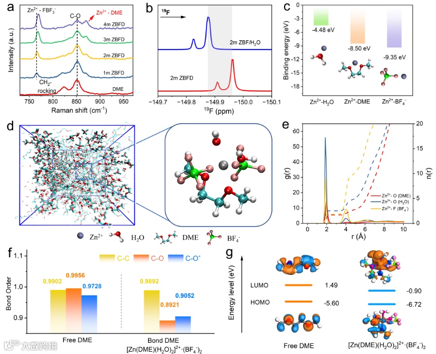 图2.(a)不同电解质的拉曼光谱和(b)19F NMR光谱。(c)Zn2+-H2O、Zn2+-DME和Zn2+-BF4-的结合能及相应模型。(d) MD模拟的3D快照和部分放大的Zn2+溶剂化结构的快照。(e)从分子动力学模拟中收集Zn2+-O和Zn2+-F的径向分布函数和配位数。(f)通过DFT计算得到了DME中不同键在自由和束缚状态下的键级,其中DME中的C-O和C-O* 分别代表氧原子与非末端碳和末端碳形成的键。(g)自由态DME和[Zn(DME)(H2O)2]2+·(BF4-)2的HOMO/LUMO能级。