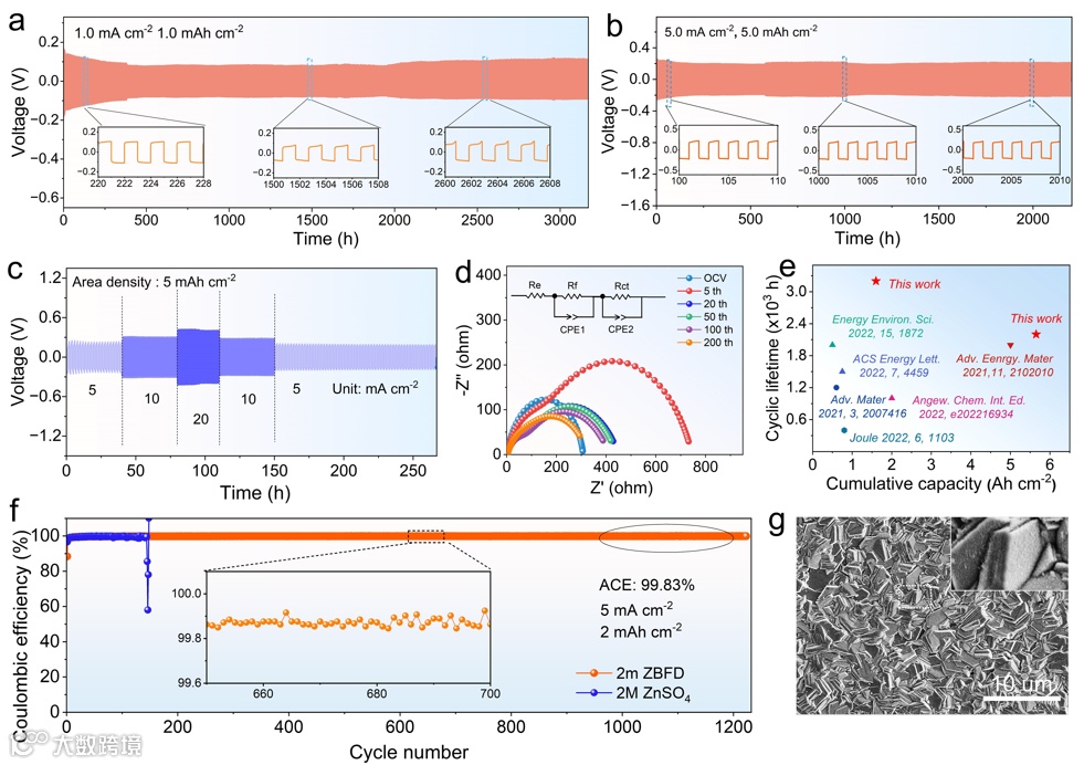 图5. 对称电池在ZBFD电解液中分别在(a)1 mA cm−2、1 mAh cm−2和(b)5 mA cm−2、5 mAh cm−2下的恒电流循环(插图:电压曲线的放大曲线)。(c)面积容量为5 mAh cm−2时的倍率性能。(d)不同循环后Zn对称电池的奈奎斯特图。(e)ZBFD电解液体系与其他先前报道的电解质系统的比较。(f)Zn沉积/剥离的库仑效率和(g)对应的SEM图像。