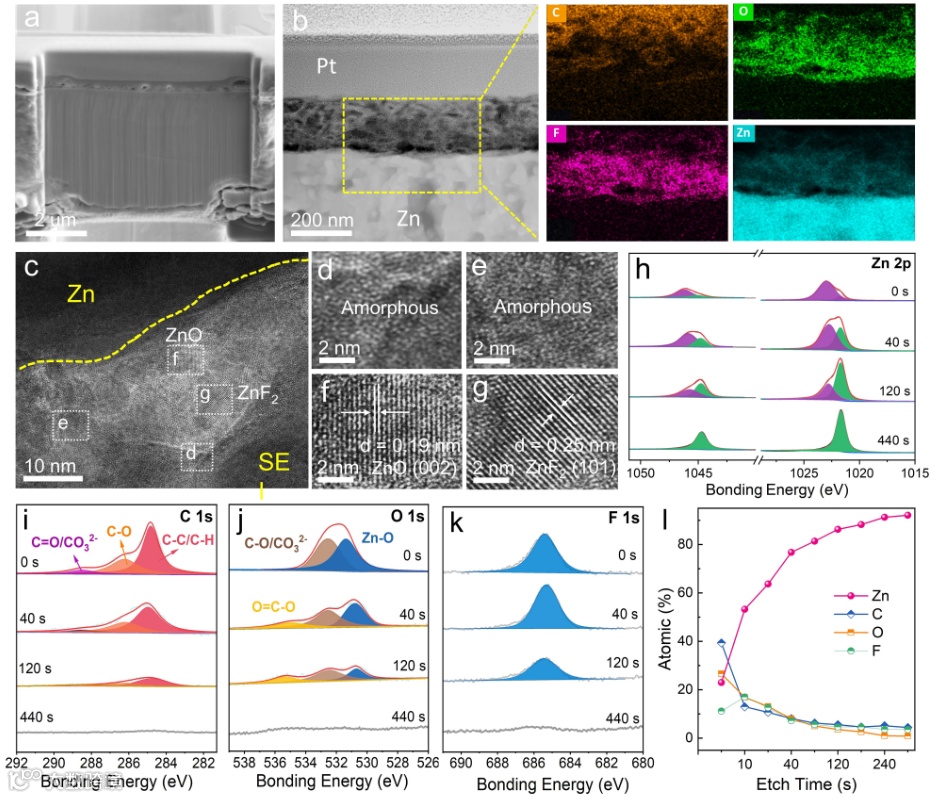 图3.(a)在ZBFD电解质中循环的Zn电极的FIB-SEM横截面图像。(b)SEI的TEM图像和EDS映射。标测区域由黄色矩形框指示。Pt沉积在电极表面上以保护SEI在样品制备期间免受离子束损伤。(c-g)在ZBFD电解质中循环的Zn电极的HRTEM图像。(h)Zn 2p、(i)C 1s、(j)O 1s和(k)F 1s随Ar+溅射时间的XPS高分辨谱。(l)在不同Ar+溅射时间下循环的Zn电极上SEI的原子组成比。