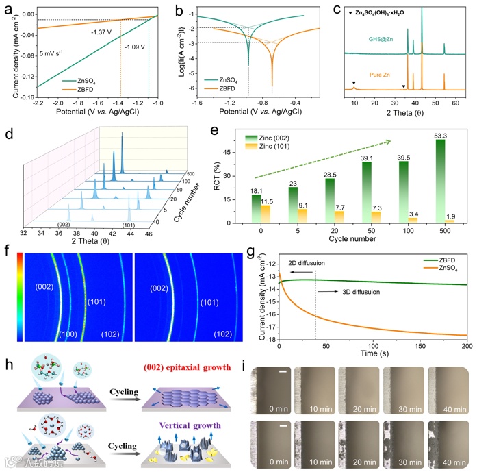 图4.(a)在ZBFD和ZnSO4电解质中测量Zn电极的LSV曲线和(B)Tafel曲线。(c)浸入ZnSO4电解质中3天的GHS@Zn和裸Zn的XRD谱。(d)在5 mA cm-2、2 mAh cm-2下在ZBFD电解质中循环不同时间后的ZMA的XRD谱。(e)不同晶面的计算RTC值。(f)在ZnSO4电解质(左)和ZBFD电解质(右)中循环的ZMA的2D-GIXRD图案。(g)-0.15V下在200 s内在不同电解质中的Zn箔的计时电流图。(h)ZBFD电解质(上)和ZnSO4电解质(下)中的Zn沉积行为的示意图。(i)原位记录Zn沉积的光学显微图像(0、10、20、30和40分钟),比例尺为200 μm。