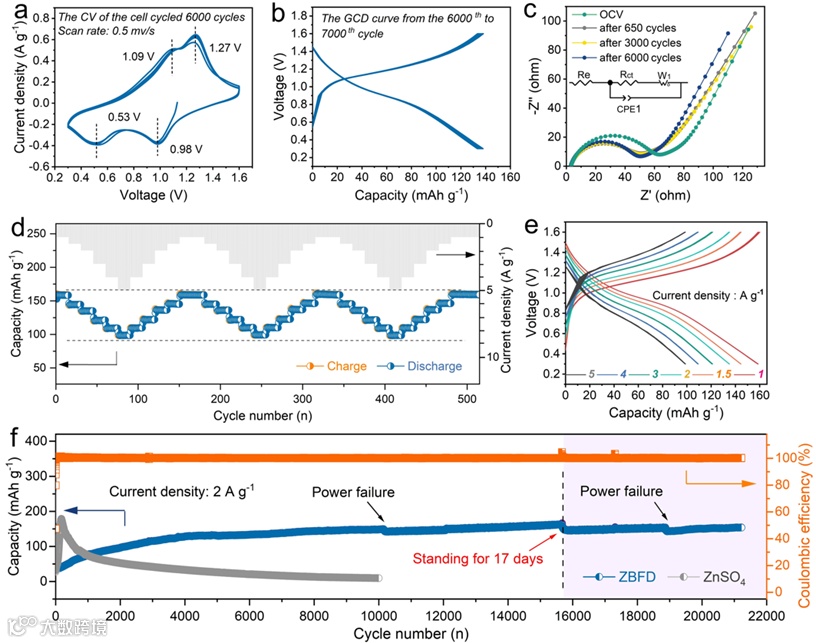 图7.(a)Zn//V2O5全电池的CV曲线和(b)充放电曲线。(c)不同循环后的Zn//V2O5全电池的EIS谱。插图显示了用于拟合的等效电路图。(d)倍率性能和(e)对应的充/放电曲线。(f)Zn//V2O5电池在2 A g-1电流密度下的循环稳定性。