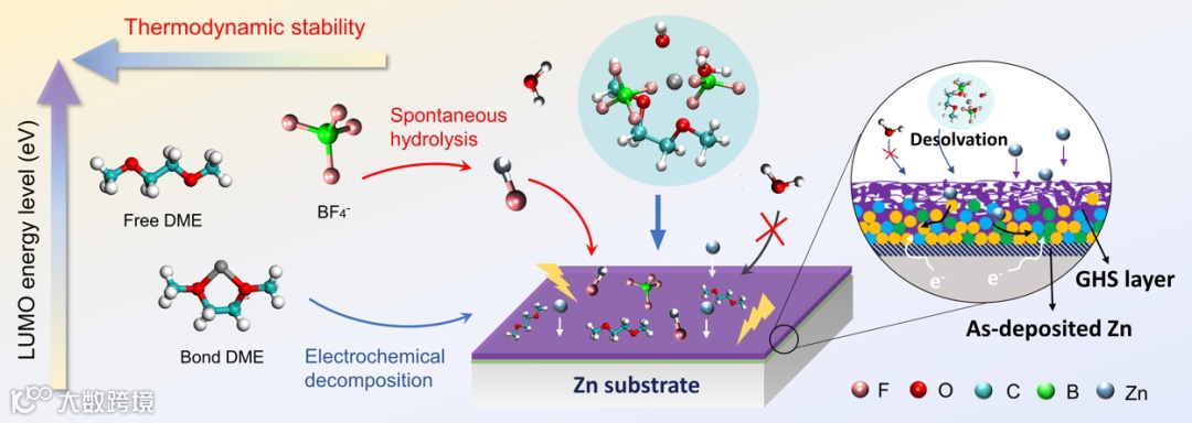 通过拉曼、核磁和第一性原理表明DME和BF4-参与溶剂化结构从而导致锌离子的配位环境发生变化。分子动力学模拟(MD)进一步确定了ZBFD电解液中锌离子的溶剂化结构,3D快照显示BF4-, DME和H2O 分子同时参与溶剂化结构。有机和无机配体共存的强配位效应促进了电子的重新分布,DME分子的柔性链结构发生显著变化。通过计算Mayer键级得到DME中的C-O键级由1.00(自由态)下降到0.89(束缚态),说明配位的DME分子热力学稳定性降低,这一点通过降低的LUMO能级被进一步确定,这为原位诱导SEI的形成提供了可能性。