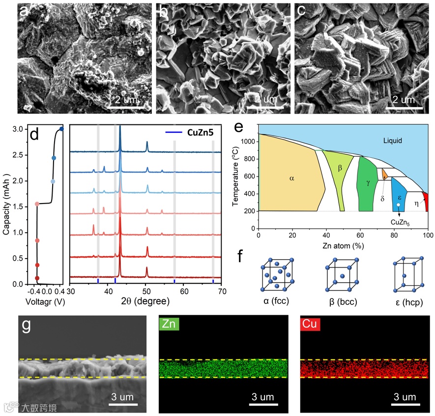 图6.(a-c)在0.2、0.5和1.0 mAh下于ZBFD电解质中在Cu电极上电镀Zn的SEM图像。(d)在第20次Zn镀覆/剥离循环期间Cu电极的XRD图案。(e)二元相图和(f)相应的Cu-Zn合金的晶体结构。(g)在20个Zn沉积/剥离循环之后的Cu电极横截面的SEM图像以及Zn和Cu的元素分布。