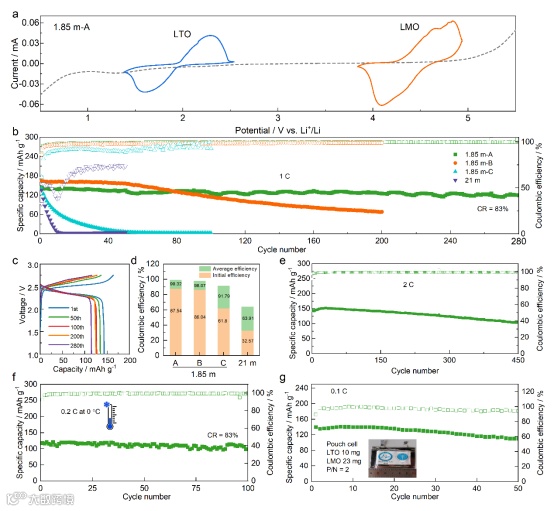 所设计的电解液组装的LTO||LMO全电池表现出优异的循环性能,同时在低温0℃下也能稳定循环。