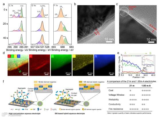 通过XPS表征,发现所设计的电解液随着刻蚀深度的加深,由TFSI−阴离子分解的LiF含量增加,而IDE衍生而来的有机物和Li2CO3的含量几乎保持不变。SEI膜中的无机成分能够增加膜的机械强度和加速Li+的传输,而有机成分能增加膜的韧性。因此,这种既富含无机物的SEI层,同时又含有IDE衍生的弹性有机物成分,不仅能够有效地抑制H2O的分解,而且具有很高的强度和柔韧性,可以保持其结构完整性,从而避免膜破裂并暴露其新鲜表面,从而有效抑制了循环过程中的副反应。同时TEM表征发现SEI膜均匀致密,能够有效的抑制水的分解。