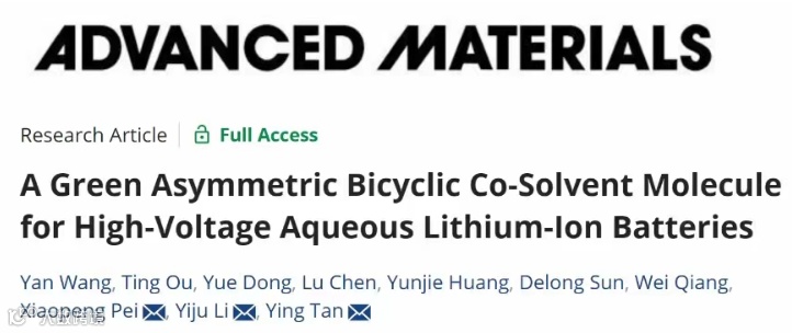 近日,来自国科温州研究院的谭颖研究员团队与南方科技大学的李一举教授合作,在国际知名期刊Advanced Materials上发表题为“A green asymmetric bicyclic co-solvent molecule for high-voltage aqueous lithium-ion batteries”的文章。通过选取具有特殊不对称双环分子结构的生物基异山梨醇二甲醚作为共溶剂,报道了一种新型的高压、不可燃、无毒的低盐浓度(1.85m)的水系锂离子电池电解液。