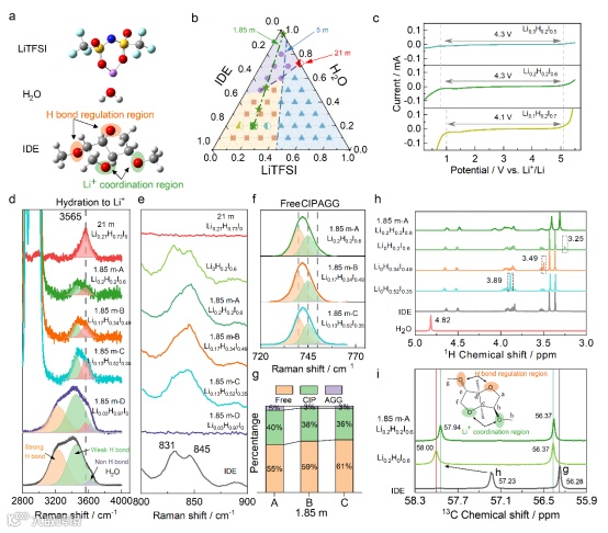 水系锂离子电池具有安全性高、环境友好等优点,是大规模储能的候选材料。然而,水固有的狭窄的热力学电化学稳定窗口(1.23 V)限制了其实际应用。将水系电解液与有机共溶剂分子杂化被认为是一种可以扩大水系电解液电化学稳定窗口的有效策略,但大多数报道的有机共溶剂通常易燃且有毒。因此,在不牺牲水系电解液安全性的情况下获得较宽的电化学窗口(≥4 V)仍然是一个巨大的挑战。本文报道了一种生物基异山梨醇二甲醚(IDE)杂化的水系绿色电解液体系。IDE的不对称双环分子结构可以诱导形成大的空间位阻并有效调控电解液的溶剂化结构,同时IDE的多个氧原子可以调控电解液的氢键网络,从而显著提高水系锂离子电池的循环性能。