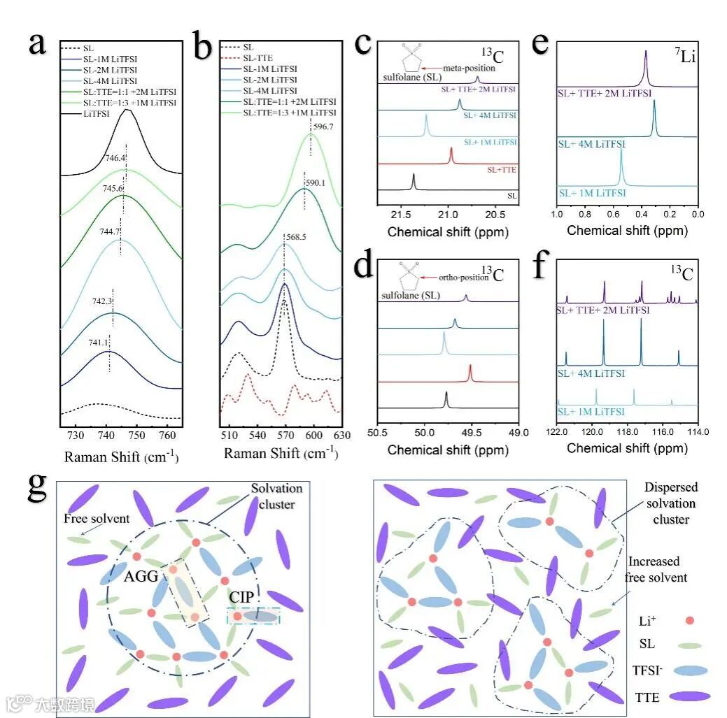 图2. 由SL, TTE和LiTFSI组成的不同样品的拉曼光谱中 (a) TFSI−和 (b) SL所对应的波段;不同样品的13C NMR谱中 (c) SL的间位C波段, (d) 邻位C的波段和LiTFSI的波段; (e) 不同样品的7Li NMR谱;(g) 局部高浓度电解质中溶剂化团簇结构示意图。