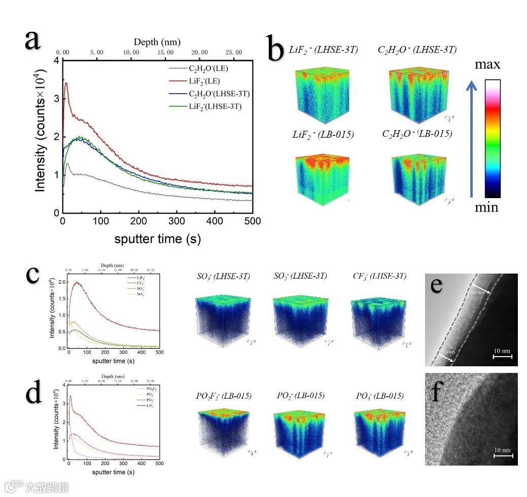 图5. (a) 正极表面上LiF2−(氟化锂)和C2H2O−(有机成分)的ToF-SIMS深度分布; (a)正极表面溅射区域中的LiF2−和C2H2O−的空间分布视图; (c) LHSE-3T和 (d) LB-015中不同锂盐衍生物的空间分布视图; (e) LHSE-3T和(f) LB-015中循环后的正极颗粒表面的TEM图像。