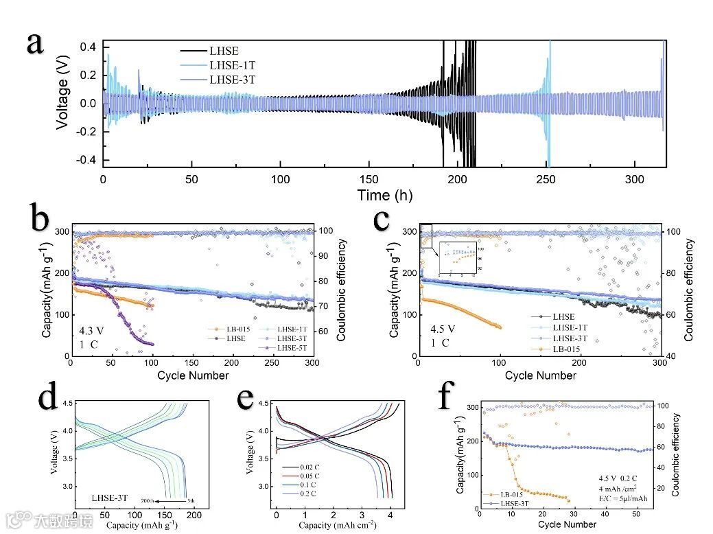 图4. (a) 不同电解液在Li||Li对称电池中0.5 mA cm−1下的循环性能; 不同电解质在 (b) 4.3 V, 1C (c) 4.5 V, 1C下的循环性能; (d) LHSE-3T的GCD曲线; 具有高质量负载正极和贫电解液中 (e) LHSE-3T的GCD曲线和 (f) LB-015与LHSE-3T的循环性能。