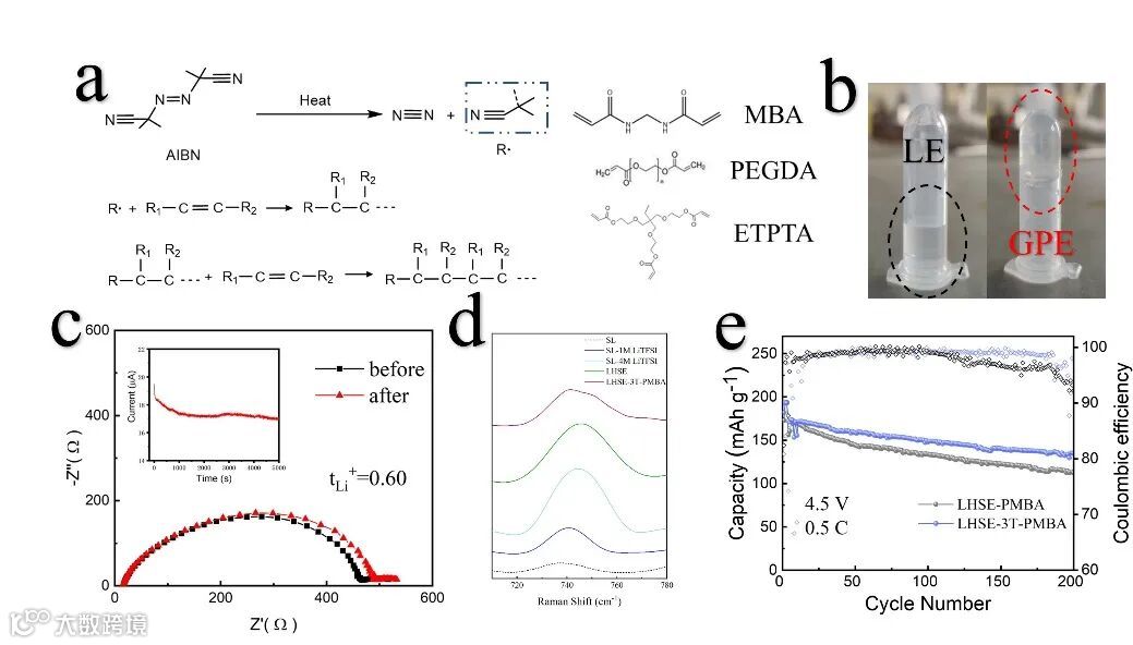 图7. (a) 电解液的原位凝胶化机理; (b) 由PMBA凝胶化LHSE-3T前后的影像; (c) LHSE-3T-PMBA的Li+迁移数; (d) 不同电解质的拉曼位移; (e) LHSE-PMBA和LHSE-3T-PMBA在NCM811||Li电池中的循环性能。