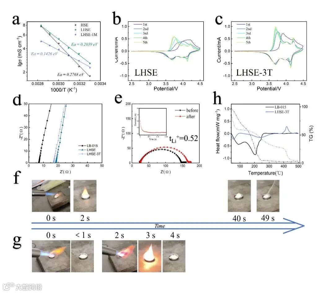 图3. (a) 不同成分的电解液的离子电导率和活化能; (b) LHSE和 (c) LHSE-3T在NCM811||Li电池中初始5次循环的CV曲线,其中LHSE为SL:TTE=1:1 vol%+2 M LiTFSI,LHSE-3T为SL:TTE=1:1 vol%+1.97 M LiTFSI-0.03 M LiFSI; (d) LHSE,LHSE和商用酯基LB-015电解液在室温下的离子电导率; (e) LHSE-3T的离子迁移数;(f) LB-015和 (g) LHSE-3T的直接燃烧;(h) LB-015和LHSE-3T的DSC-Tg曲线。