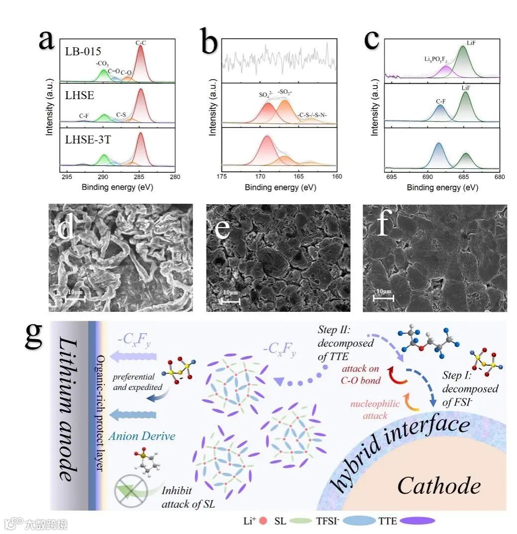 图6. LB-015, LHSE, LHSE-3T中循环后的负极表面样品的XPS中 (a) C 1s; (b) S 2p (c) F 1s 谱; 在 (d) LB-015, (e) LHSE和 (f) LHSE-3T中100次循环后的锂片表面形貌;(g) LHSE-3T电解液中两个电极上的界面形成机理示意图。