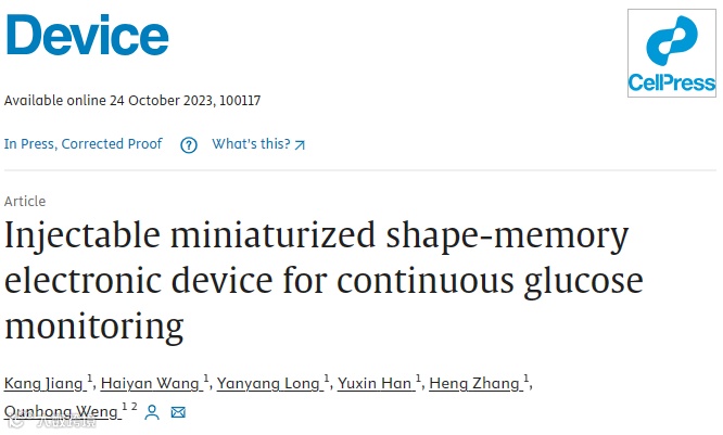 该SMED不仅检测性能优异,而且相对于手术植入减少了约73%的伤口面积、约45%的愈合时间,从而在很大程度上解决了可植入医疗器件所面临的创伤性植入这一普遍问题。相关成果以“Injectable miniaturized shape-memory electronic device for continuous glucose monitoring”为题发表在Cell Press细胞出版社旗下期刊Device上。