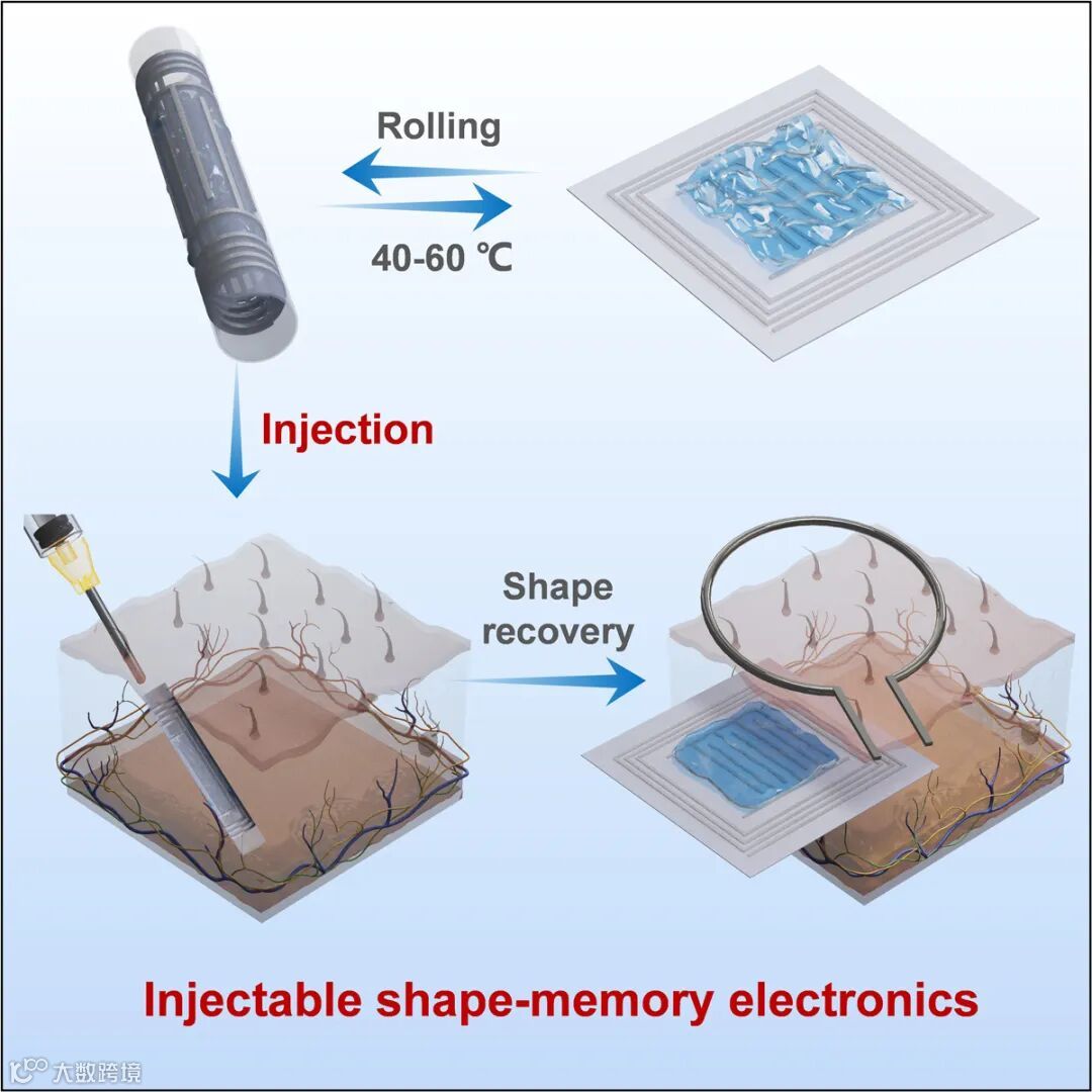 对此,湖南大学翁群红课题组提出了一种形状记忆电子器件(SMED)的思路,将器件“卷”成圆管状来进行微创注射植入,后经温和的热刺激迅速将其恢复到原来的平面形状并实现器件的功能。