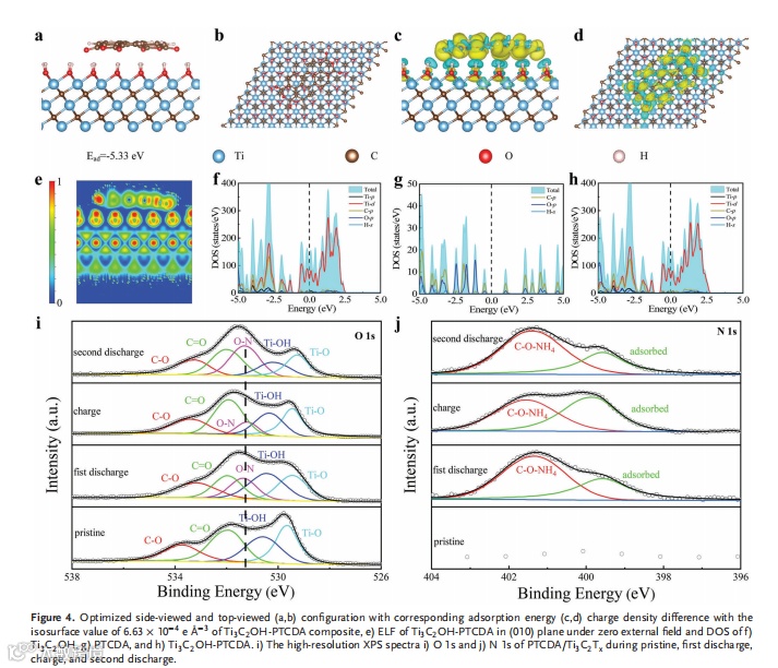 通过DFT计算和不同电荷态下的XPS谱揭示了具有超稳定和快速NH4+存储的PTCDA/Ti3C2Tx MXene自支撑薄膜的机理。PTCDA的O原子靠近Ti3C2OH的H原子,相应的吸附能为−5.33 eV,表明其稳定吸附。电荷转移发生在界面处,其中 H 原子主要失去电子,而 C 和 O 原子则获得电子。Ti3C2OH的离子特征和PTCDA的共价特征很明显,其中电子局域化是可见的并且与电荷转移一致。通过异位 XPS 表征研究了其结构演化,在放电过程中,NH4+与C=O生成O−N键。在充电过程中,O−N键减少,然后在第二次放电过程中再次增加。在XPS N 1s图像中,401.5 eV处的CO−NH4峰也随着充放电过程发生可逆变化。这表明NH4+在储能材料过程中是可逆的。