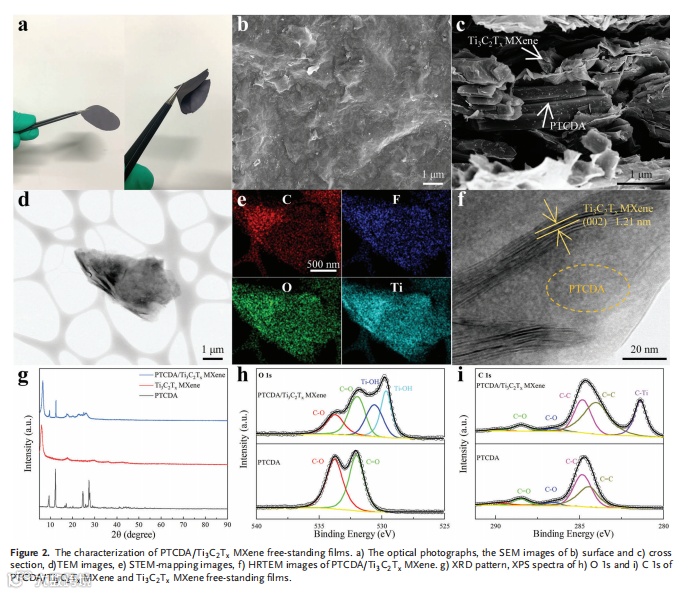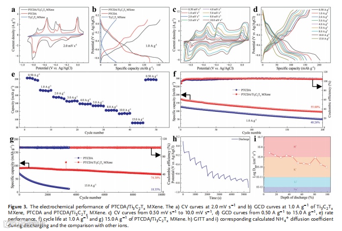 以苝为代表的有机材料资源丰富、易于合成,被认为是最有前途的负极材料。苝-3,4,9,10-四甲酸二酐(PTCDA)尽管已表现出良好的NH4+存储能力,但仍存在许多挑战,例如电导率低以及离子嵌入/萃取过程中的溶解等。一般来说,有机分子整合到导电骨架上可以有效增强电子传递并保证结构稳定。Ti3C2Tx MXene 作为一种新型二维材料,由于过渡金属的存在,比传统碳基导体具有更好的电导率(约 104 S cm−1)和吸附能力。然后使用溶剂置换合成了Ti3C2TxMXene/DMF。通过简单的溶液混合和萃取过滤进一步制备了PTCDA/Ti3C2Tx MXene自支撑薄膜。